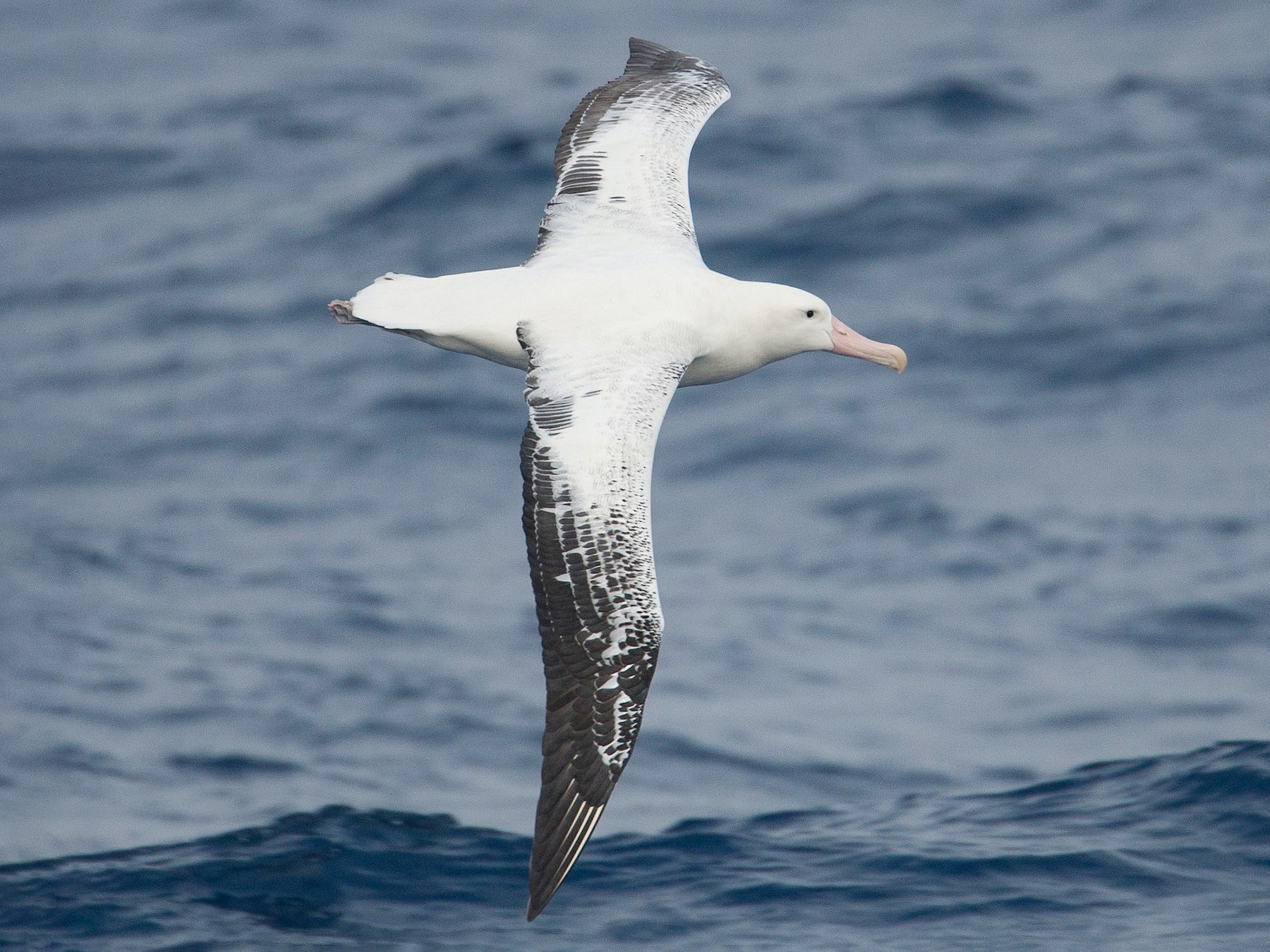 Main colonies of the snowy nest on South Georgia in the South Atlantic, and various islands in the southern Indian Ocean, but ranges extensively at sea. Plumage of the snowy is highly variable, starting chocolate-brown with a white face and gradually becoming whiter over many years. Younger birds separated from Southern Royal Albatross by darker tail, brown markings on head and back, and lack of black “lips” on cutting edge of bill. Older Snowy birds are much more difficult to separate; as a birdwatcher it is key to focus on more coarsely marked upperwings, often with conspicuous white patch in center of wing, and lack of black “lips.” Wandering Albatross, other than the Southern Royal bird, often show an orange stain on cheek. Identification from other Wandering-type Albatross, especially “Gibson’s” Antipodean and Tristan, is extremely difficult and often presumed by range. Adult male Snowy is the whitest of any Wandering Albatross, but intermediate ages often best left unidentified. [2]