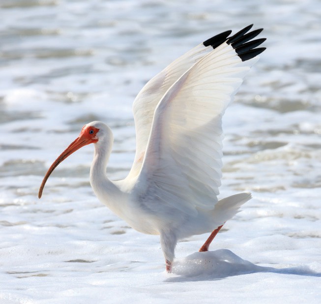 One of the outstanding bird species we come in proximity to Florida is the Ibis. Prominent for its long beak, vast color differences, and chunky body, the Ibis seems to be the biological-cross between the majestic flamingo and the squatty snipe. The colors vary from scarlet to ivory to black, with some maroon and mottled shades in the mix. My favorite is the White Ibis, as its distinctive red beak and legs are in bold contrast with its white body and black wing-tips. Plus, the flocks are such fun to watch as they play and dine in the advancing and receding surf.