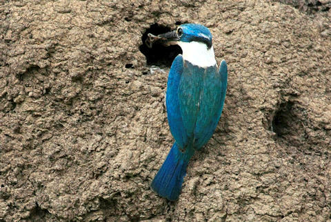 The Sacred Kingfisher that we spotted in Australia, again with Bill Crews, was a brilliantly colored diver with blue wings, white collar and breast, black beak and feet. We spotted him on the savannah outside the Daintree, nesting in an open termite mound. He was winging to the nest with a grasshopper in his mouth and looked very agile with his beak. Bill told us that they caught the insects just above the grasses and water line, displaying their acrobatic talents. We saw the end result, but missed the aerial display.