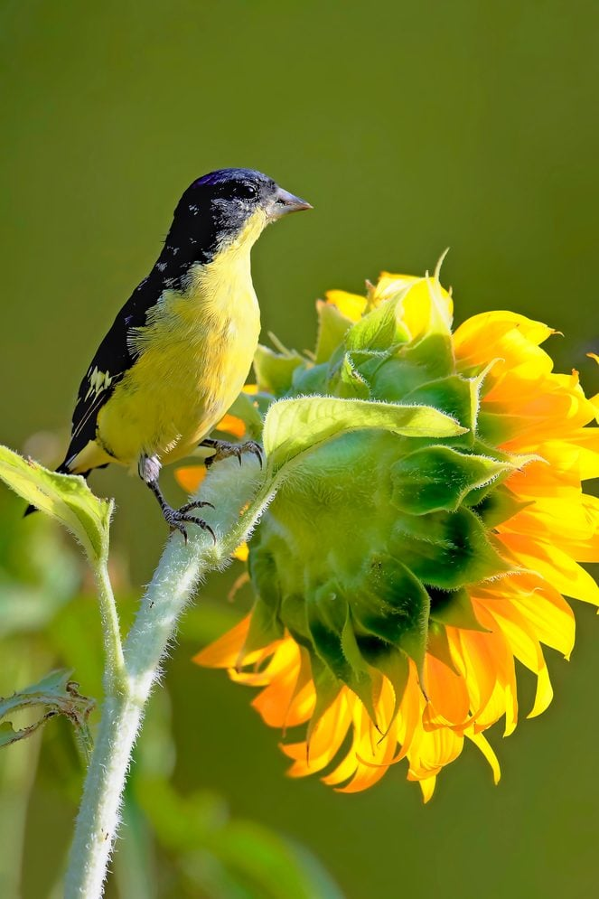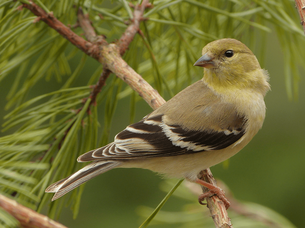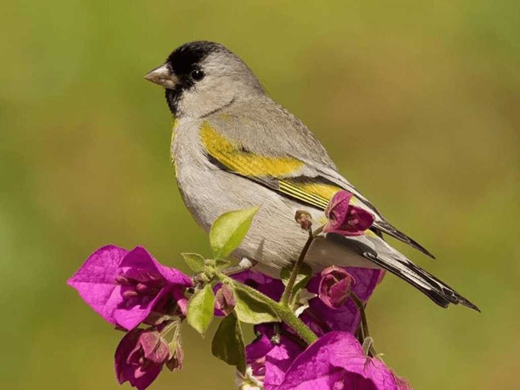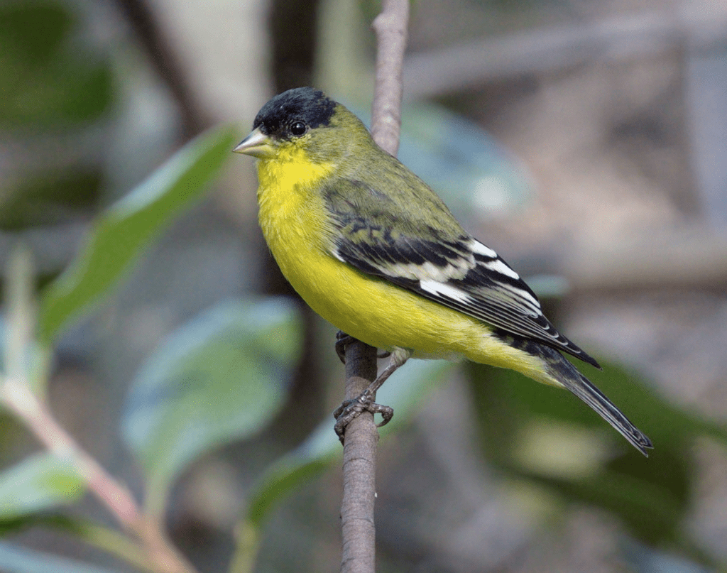 Lesser Goldfinches are known for olive green undertones. Males have yellow bellies and black caps. In the eastern part of their range, from Wyoming to Texas, they have black backs. Farther west, their backs appear green. Females sport muted olive above and yellow below. Both sexes have a white patch on their wings.