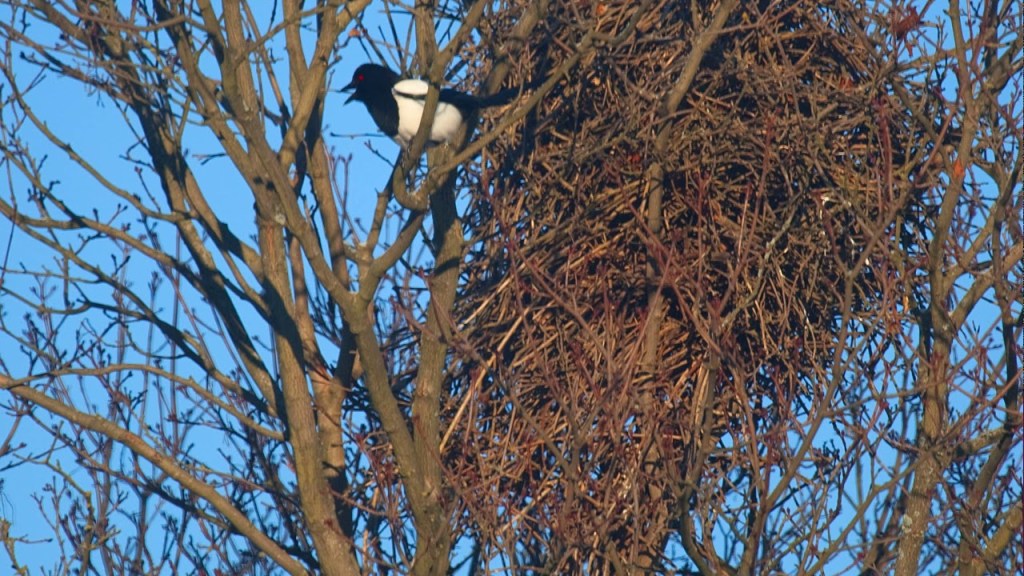 Nest site sites are usually in deciduous trees from 15-30′ above ground. Nest is a huge structure, a big globular canopy of sticks about 3′ in diameter, with entrance holes on either side. Inside the canopy is a cup-shaped nest with base of mud or manure and lining of weeds, rootlets, grass, and hair. Both sexes help build nest. These birds usually have a nest full of 5-9 eggs, rarely more. The eggs are greenish gray, heavily spotted with brown. The female remains in the nest to incubate the eggs which usually take about 18 days. Male magpies feed the females during egg-laying and incubation period. And both parents bring food to nestlings and the pair has one brood per year. Young magpies have fledged after about 25-29 days after hatching. [1]