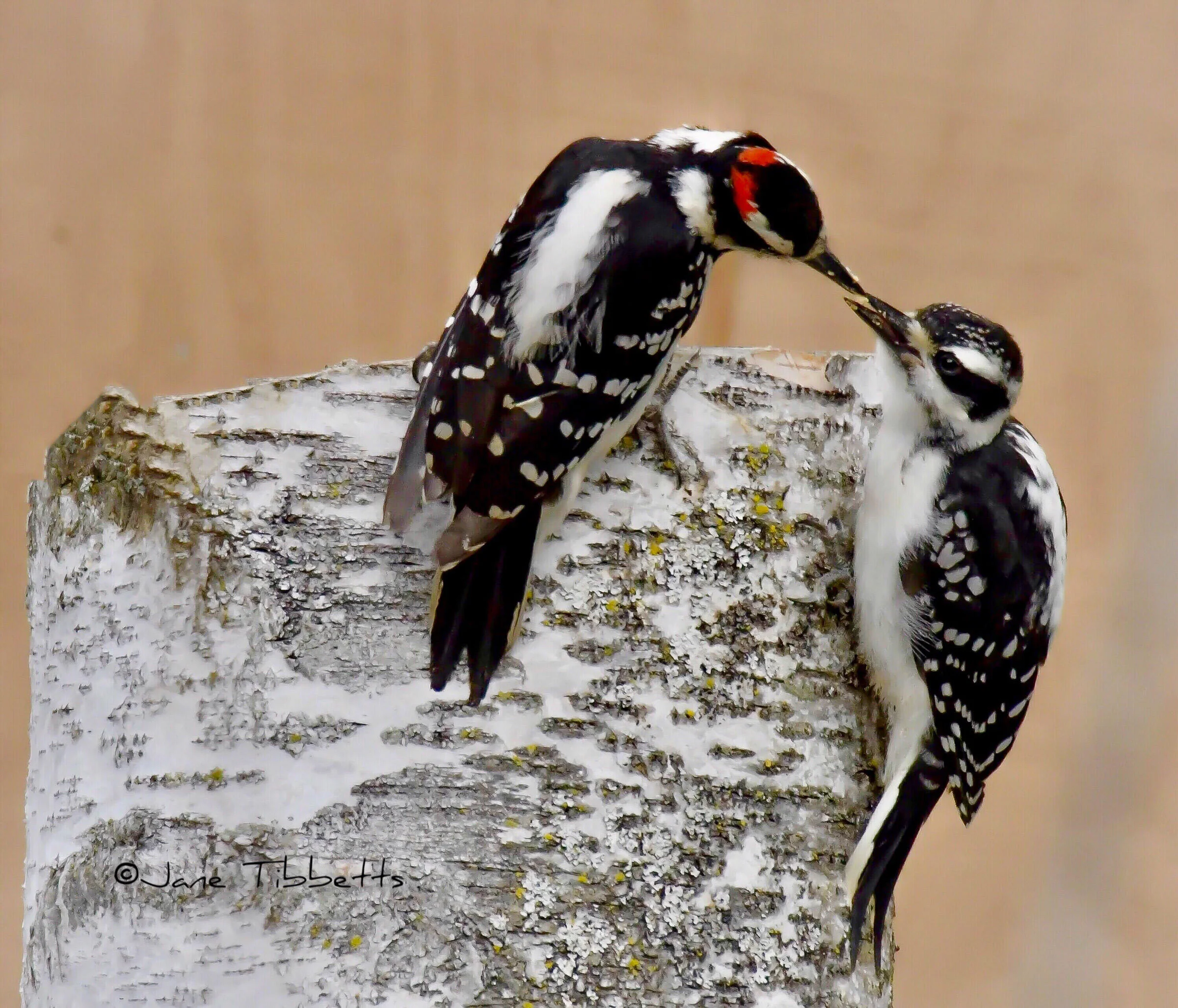 The image by Jane Tibbetts captures the parenthood of these woodpeckers perfectly. The Hairy Woodpecker and the smaller Downy Woodpecker are some of the more visible woodpeckers that will fly in undulating flight across the woodlands.