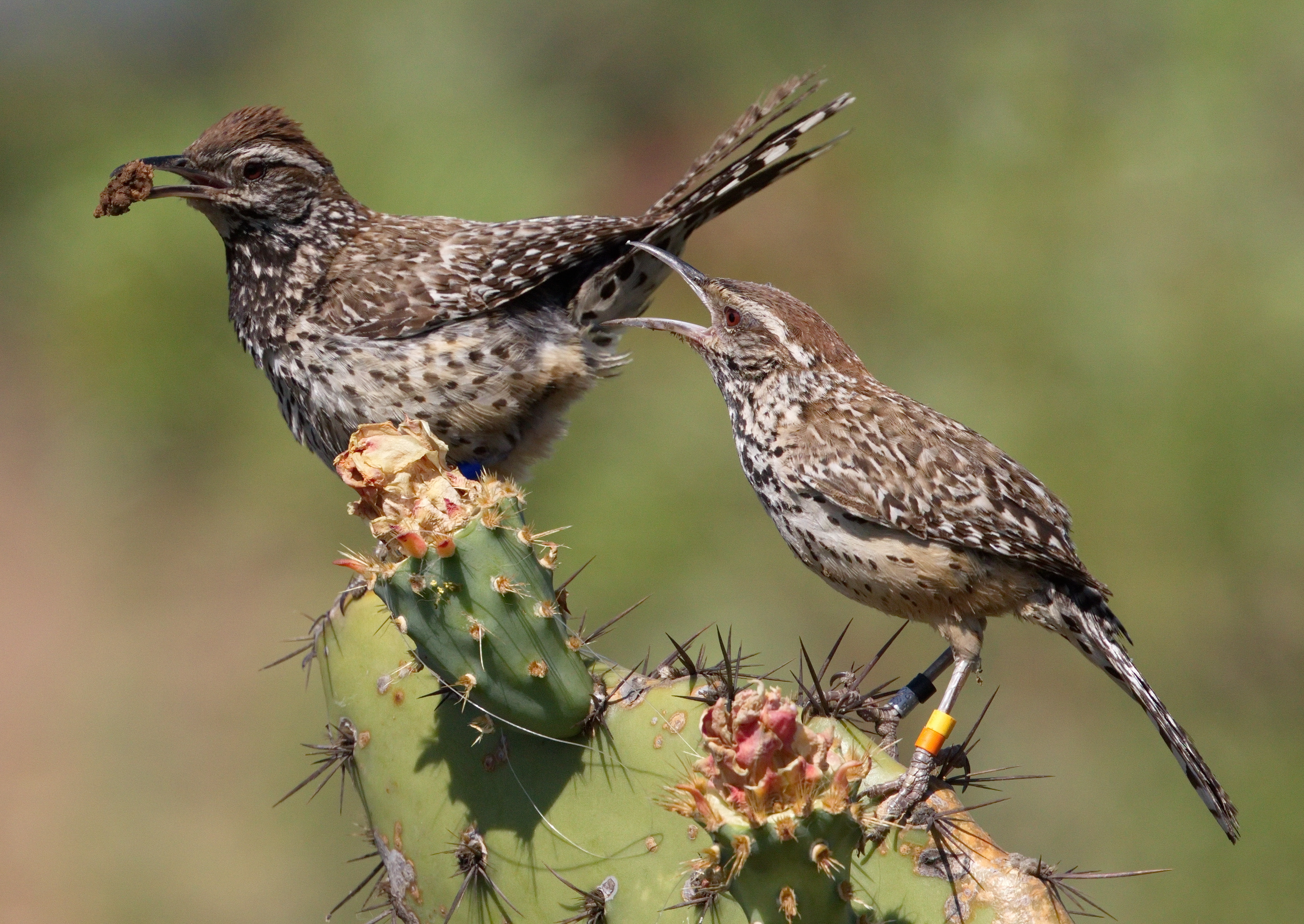 The largest of all native wrens, these birds build their nests in cacti (commonly cholla, prickly pear – pictured above – and saguaro), thorny desert trees, or yucca.