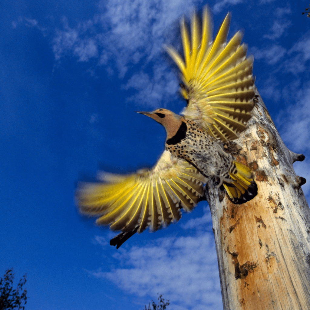 The “yellow version” of the species seems to be geographically specific, as I am more familiar with the Red-Shafted Flicker and their habits, which seem to be very similar. This woodpecker is beautiful to watch as it pecks away at decaying trees and swoops in undulating flight from trunk to trunk. The bird in the image above is on a telephone pole, which is also a frequent spot to see these birds. They will peck at nearly anything, even tin rooves, which can create quite a racket. The yellow shafted feathers are easy to spot on the ground for their bright colorization and black/yellow/white tail and wing splotches. Their black eye patches and and necklace are easy identifiers as are the white rump patches while in flight.