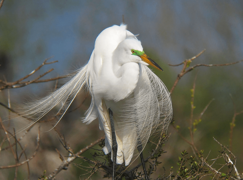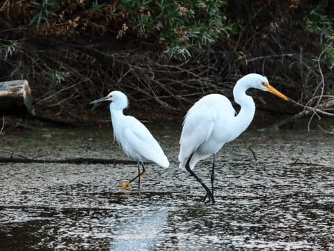 These water feeders are looking for anything that moves: snakes, snails, fish, rodents, insects. These omnivores are common in the swampy areas, where they can wade for hours, undetected by their prey. The bright beak on the mature egret is orange or yellow, often differentiated by its diet. Their long legs are black and not easily noticed by the fish swimming just below them.