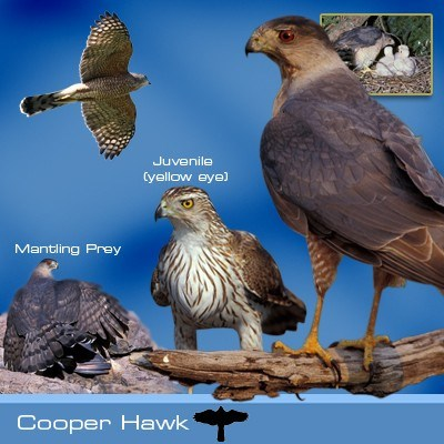 Closely resemble, but are larger than Sharp-shinned Hawks (Accipiter striatus). Cooper’s Hawks eye color changes from bluish-gray in nestlings, to yellow, in young adults and then to red in older adults. Among the bird world’s most skillful fliers, Cooper’s Hawks are common woodland hawks that tear through cluttered tree canopies in high speed pursuit of other birds. You’re most likely to see one prowling above a forest edge or field using just a few stiff wingbeats followed by a glide.