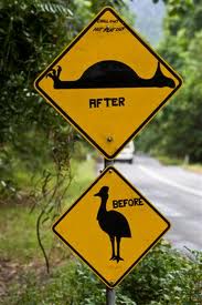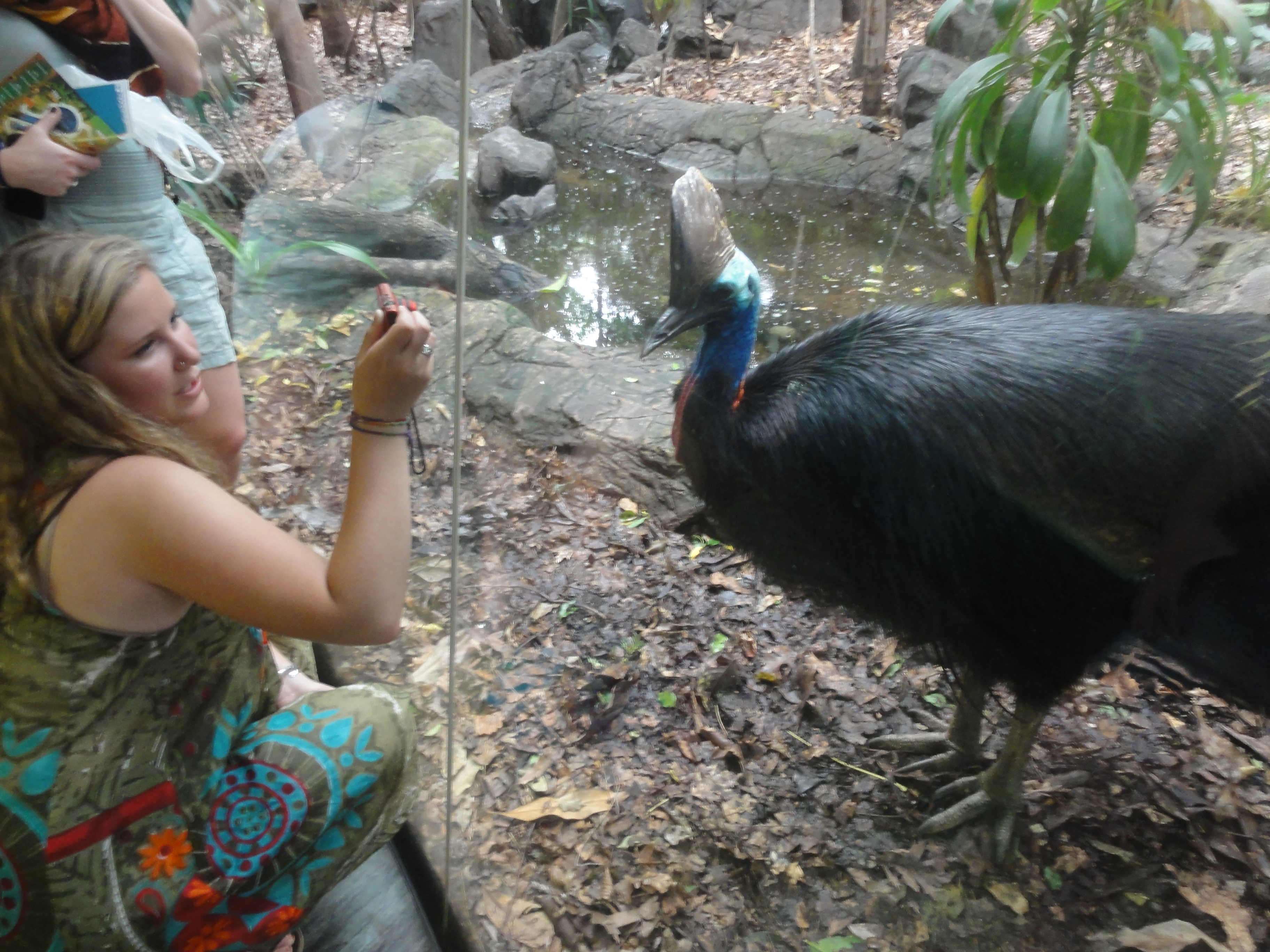 The Southern Cassowary deserves a page or two of its own. What an amazing bird! Not only is it HUGE, but it is tusked and demands a territory of several hectares. We looked for, but did not see, a cassowary in the wild. Instead, we were left with the tales of these birds that had gored tourists and huddled over eggs. We searched for them for hours in the Daintree National Park. Cassowaries are called ratites, which means they are large flightless birds which originate from the tropical rain forests of New Guinea. The Southern Cassowary is the world’s third tallest (ostrich & emu are taller) and the second heaviest (only the ostrich is heavier) living bird species. Cassowaries are mainly herbivores, although all of the species are truly omnivorous. They subsist on a diet of fruit, flowers, grass shoots, seeds, fungi, snails, insects, frogs, birds, fish, rats, mice, and carrion. Cassowaries are, therefore, called a “keystone species of the rainforest.” The health of the ecosystem depends on them. They eat fruit whole that has fallen from the canopy and they digest the sugars and distribute the seeds across the jungle floor through their feces. No shit!