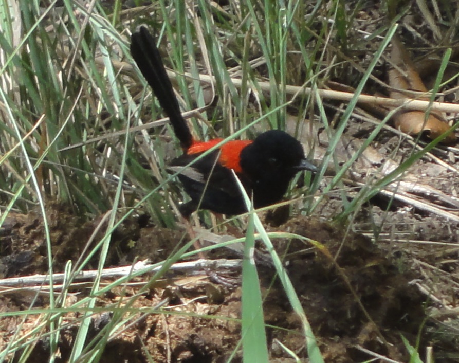 Bill Crew took us to a cow trampled marsh area, where he thought we might see the Fairy-Wren. A special blind is set up for birdwatching. Many of the Fairy-Wren species are blue, but this one has a vermillion red back, which is very distinctive. I spotted this little guy jumping around the grassy area, near the marsh, as we were about to leave the blind. He seemed to be gathering moss for his nest, which Bill point out to us as we walked on the path to the marsh.