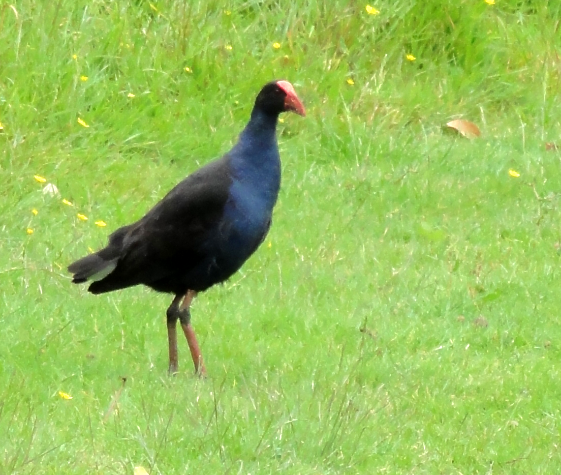 This bird looks like a Gallinule from the States, but are less secretive, and does not have the distinctive yellow tip on his bill. They seem pretty tame and Barry Coates pointed out several, which were present in city parks around Auckland. It looks very similar to the Purple Swamphen (Australia), except with a Moari name.