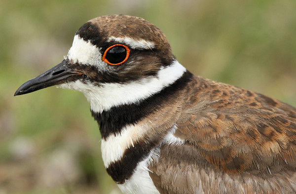 The facial markings including the orange eye ring and white and black bands are easy to see without binoculars, so this species is one of the easiest plovers to identify.