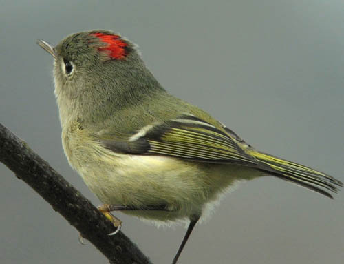 Even with strong binoculars it is easy to miss the crown and confuse the ruby-crowned with the golden-crowned species. The red looks like a mistake, as if someone cut the bird in the head with a tiny hatchet and left it’s crown bleeding. The red, when it comes into view, seems incongruous with the buff/green head color.