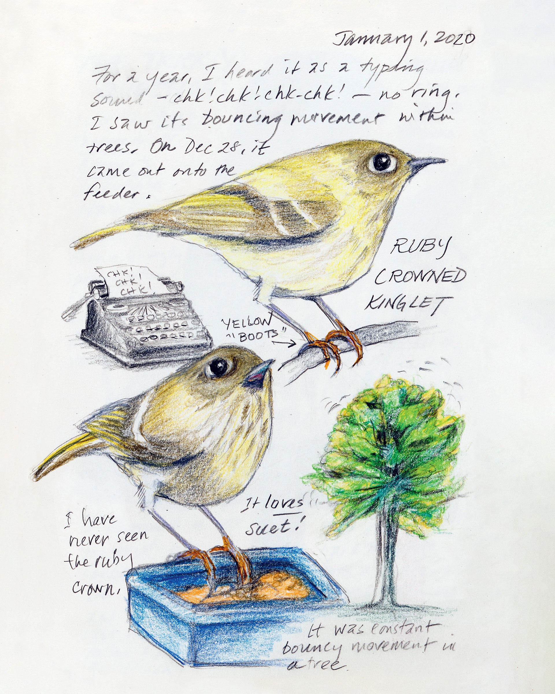 The first time I spotted a Ruby-Crowned Kinglet was in Colorado more than 30 years ago. Our family was skiing in Steamboat Springs and my brother-in-law, Mike LaFontaine, and I were cross-country skiing that day for a break from multiple tumbles on the downhill slopes. Many inches of snow fell, and the quiet of the spruce surrounded us. We took a rest, sipped some water, and listened to the power of the silence. Gently breaking the calm was the persistent cack and zhi-dit sound coming from the branches above us. Pulling out binoculars, there was this cute yellow-green bird hanging upside down and eating away. He seemed to be having the best time. And so did we, while spotting and admiring this acrobatic beauty.