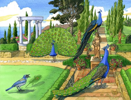 There he found lovely peacock feathers on the ground. The jay thought that he would look very pretty if he tied the feathers to his body. So he tied all the feathers to his tail and flew towards the peacocks who were dancing in merriment. They were angry at what the jay had done and called him a fraud and a cheat.