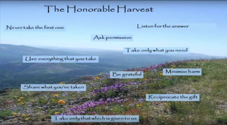 Here are The guidelines of the Honorable Harvest. In a hand-out are offered at each table today.