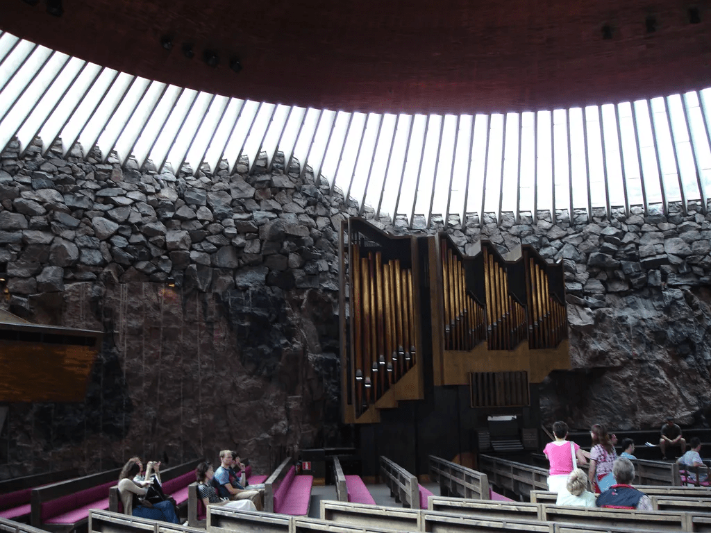 The church was built in 1961, after an architectural competition for proposals to embody a “community Church of the Rock” which would emerge out of the stone. The competition was won by the Suomalainen brothers, Timo and Tuomo, who proposed a radical design that aroused great public excitement.