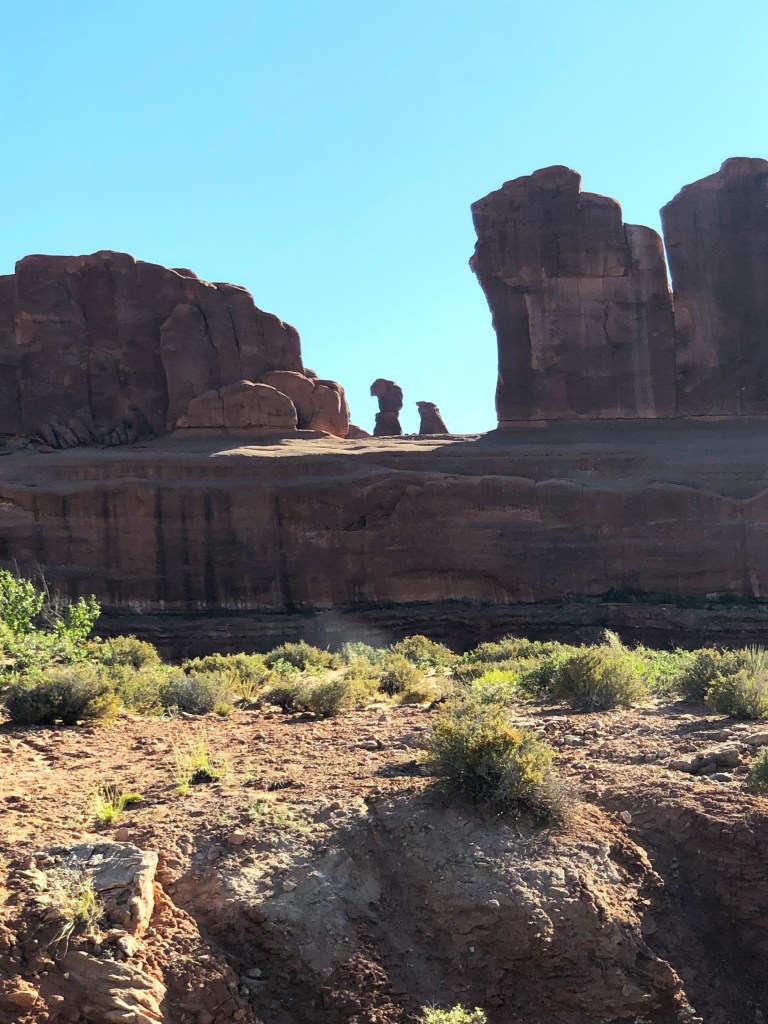 We got back in our car and headed to the better trail head. Daylight was running out, as we could tell by the long shadow made by the Arch, so we had some serious hoofing to do to catch the best views. The day windy but the sky was crystal clear, no clouds, so it was applying sunscreen and off to the races. If it were not for the altitude (5,200 or so feet above sea level) and our poor, too-many-hours-in-the-car conditioning, we could have been more relaxed in our walk.