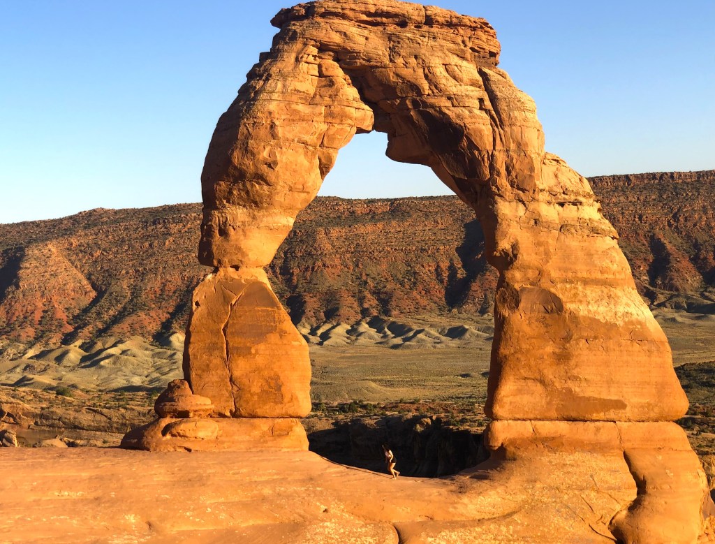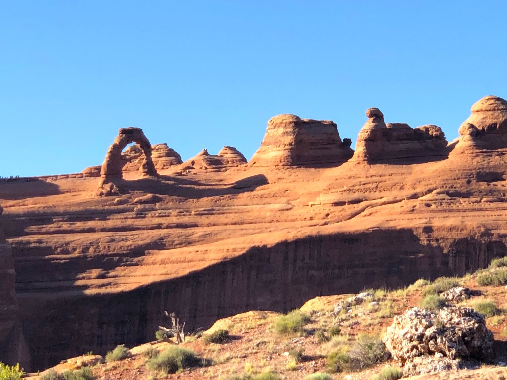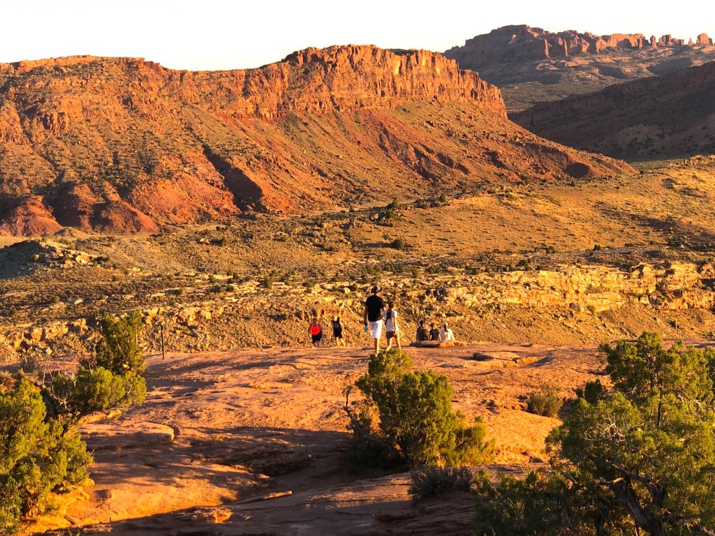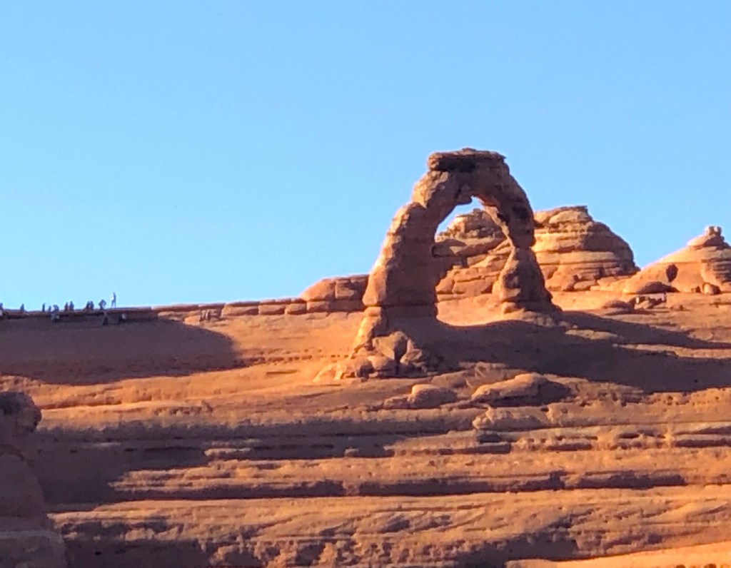 The friendly fellow at the Element Hotel’s main desk said, “Delicate Arch in Arches National Park is certainly a show stopper, but unless you have a permit, there is no way to see it this afternoon … unless you wait until after 4:00pm. That’s when the National Park is open and free to the public. The challenge will be to make it to see the best arches before the sunsets (at approximately 6:15pm this time of year).”
