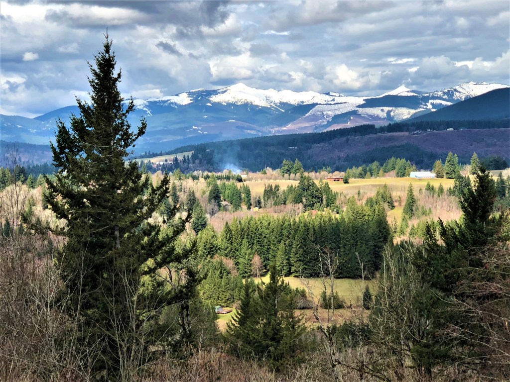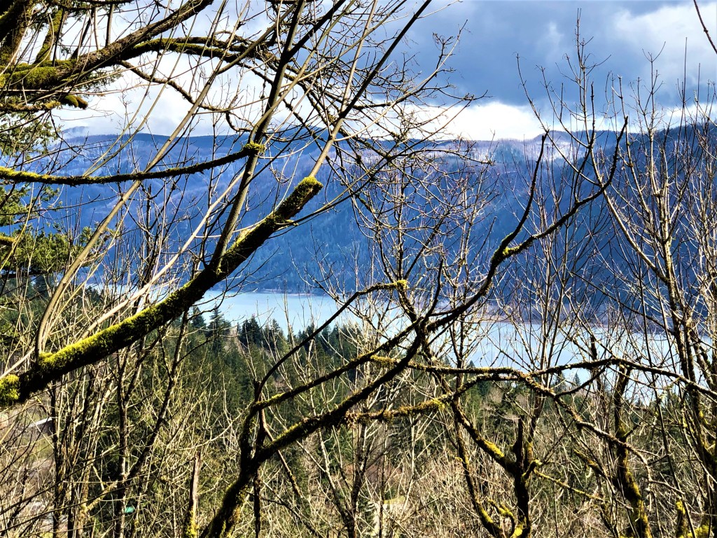 That day, Tracy and I took the first fork, the upper trail, right from the start. Crossing a small creek on the Twain Bridge, we began a steep and steady climb of the terrain north of Cape Horn. The entire trip was under a canopy of big leaf maples, Douglas Fir, and Western Hemlock trees. On the forest floor were sword ferns, Oregon Grape and vine maples. The path was damp, but surprisingly unmuddied, given all of the rain and snow we have had in the winter of 2022-23. We reached the first overlook at the 1.2 mile mark and took in views of the snow covered Cascades, including Mt. Adams.