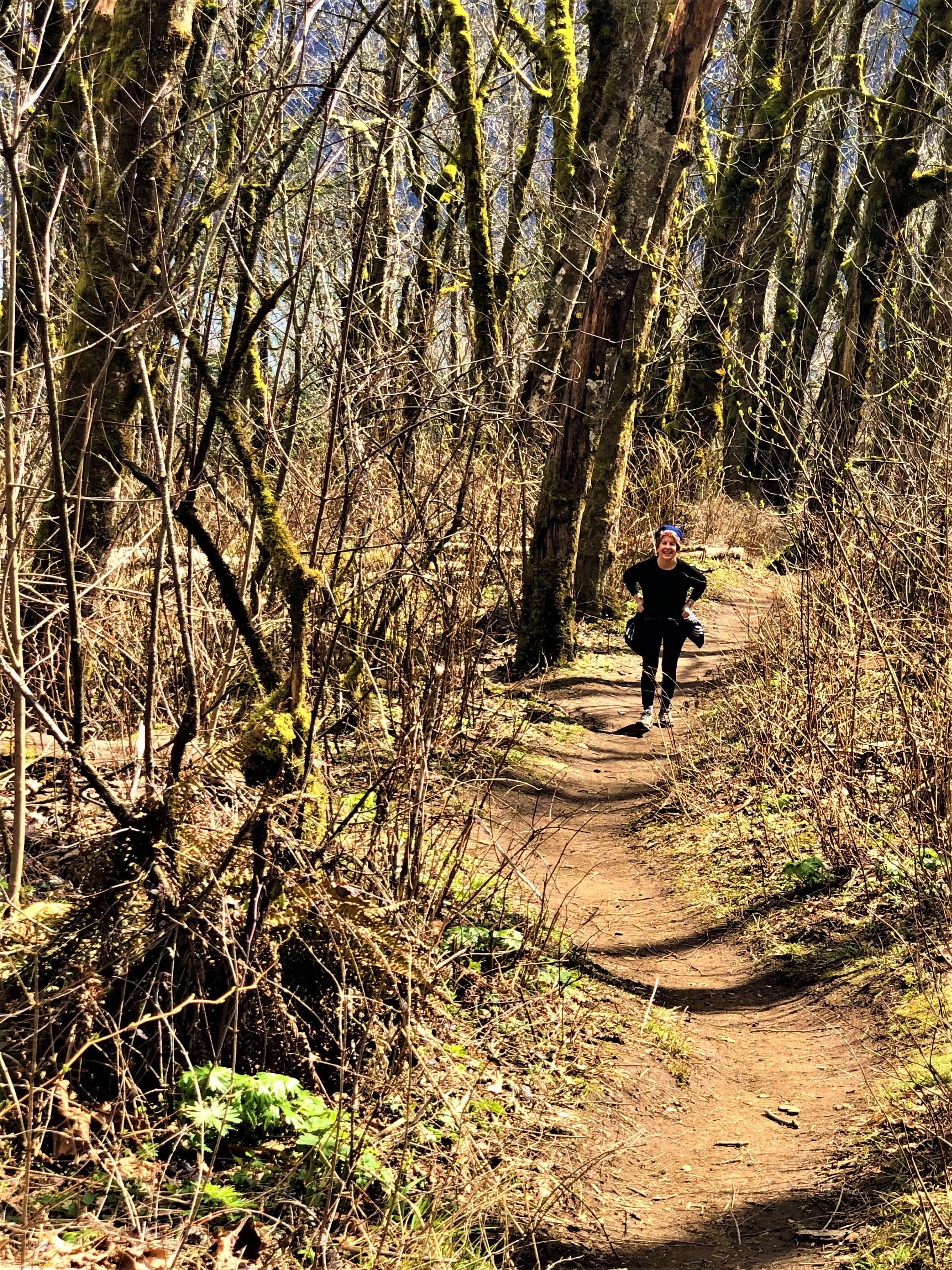 The entire loop consists of two segments separated by Highway 14; each segment is mostly single track. Sections of the trail have been maintained by volunteers from the Washington Trail Association, who helped transform the hillside from an old road to Forest Service standards trail. We hiked the first segment to the wonderful vista point at an elevation of 1,300 feet. We started by leaving our car at the intersection of Salmon Falls Road and Highway 14, which has a Park & Ride, right next to and across the road from the trailhead. The signage, pit toilets, parking area, and maps are great and leave no room for doubt as to “which way is that trail anyway?”