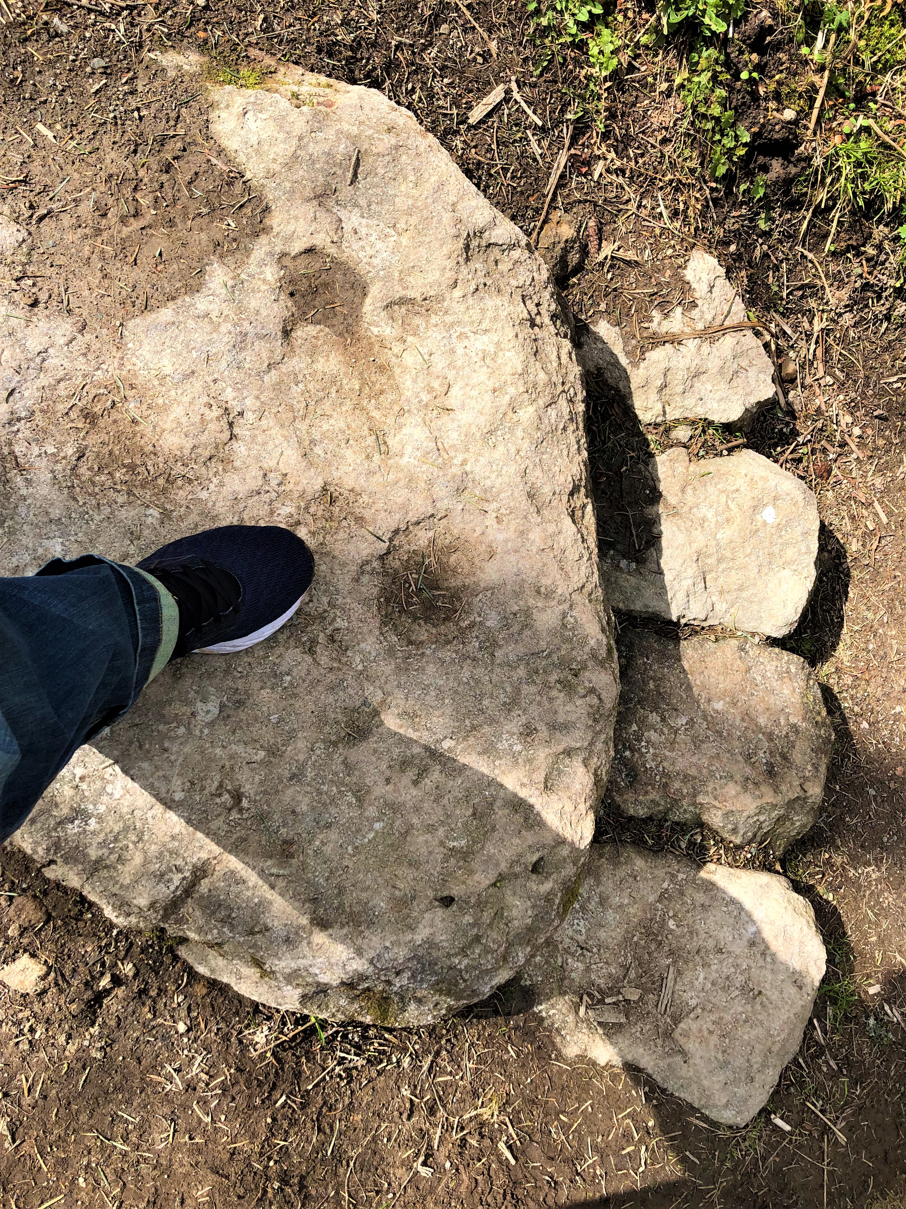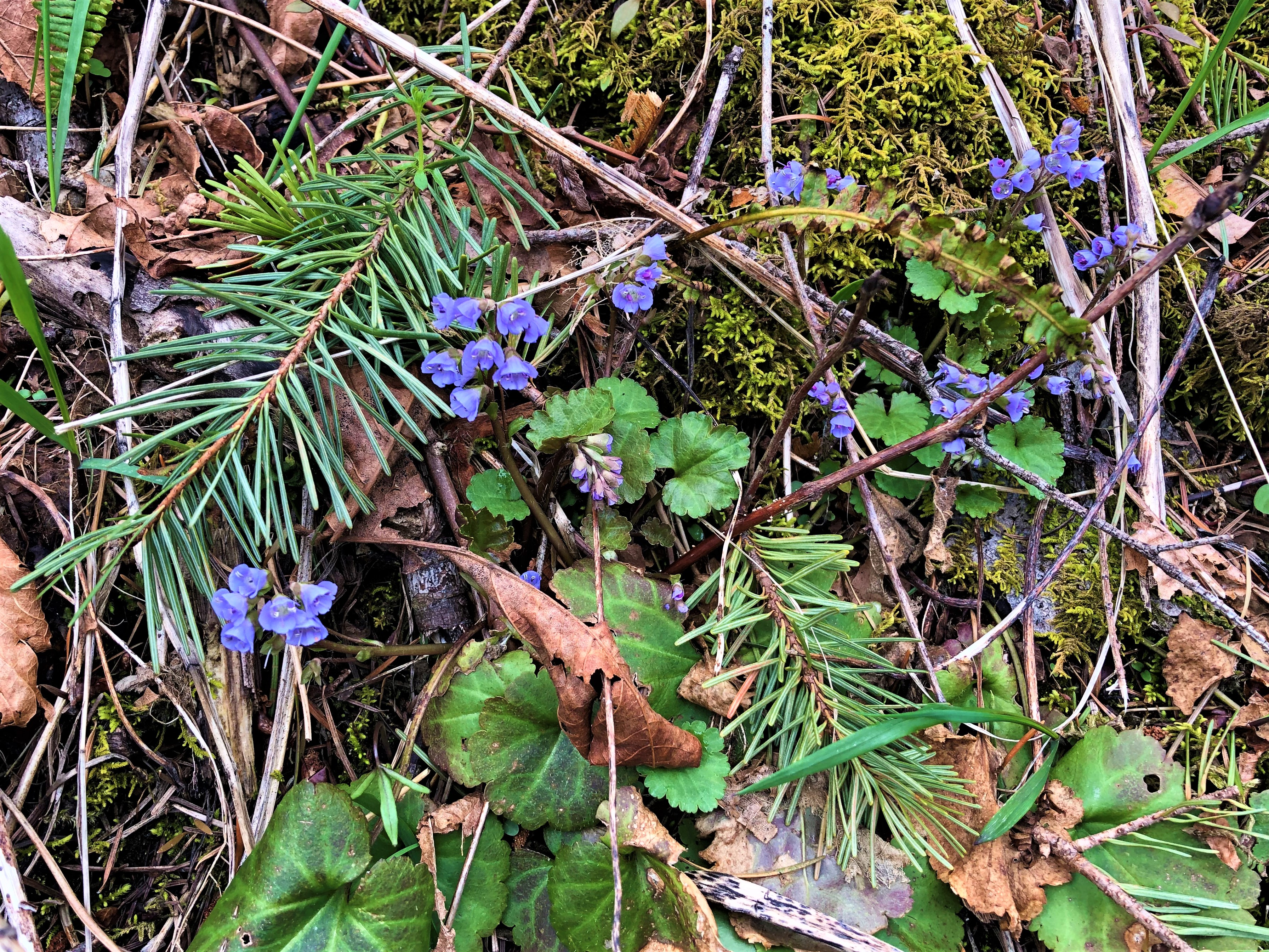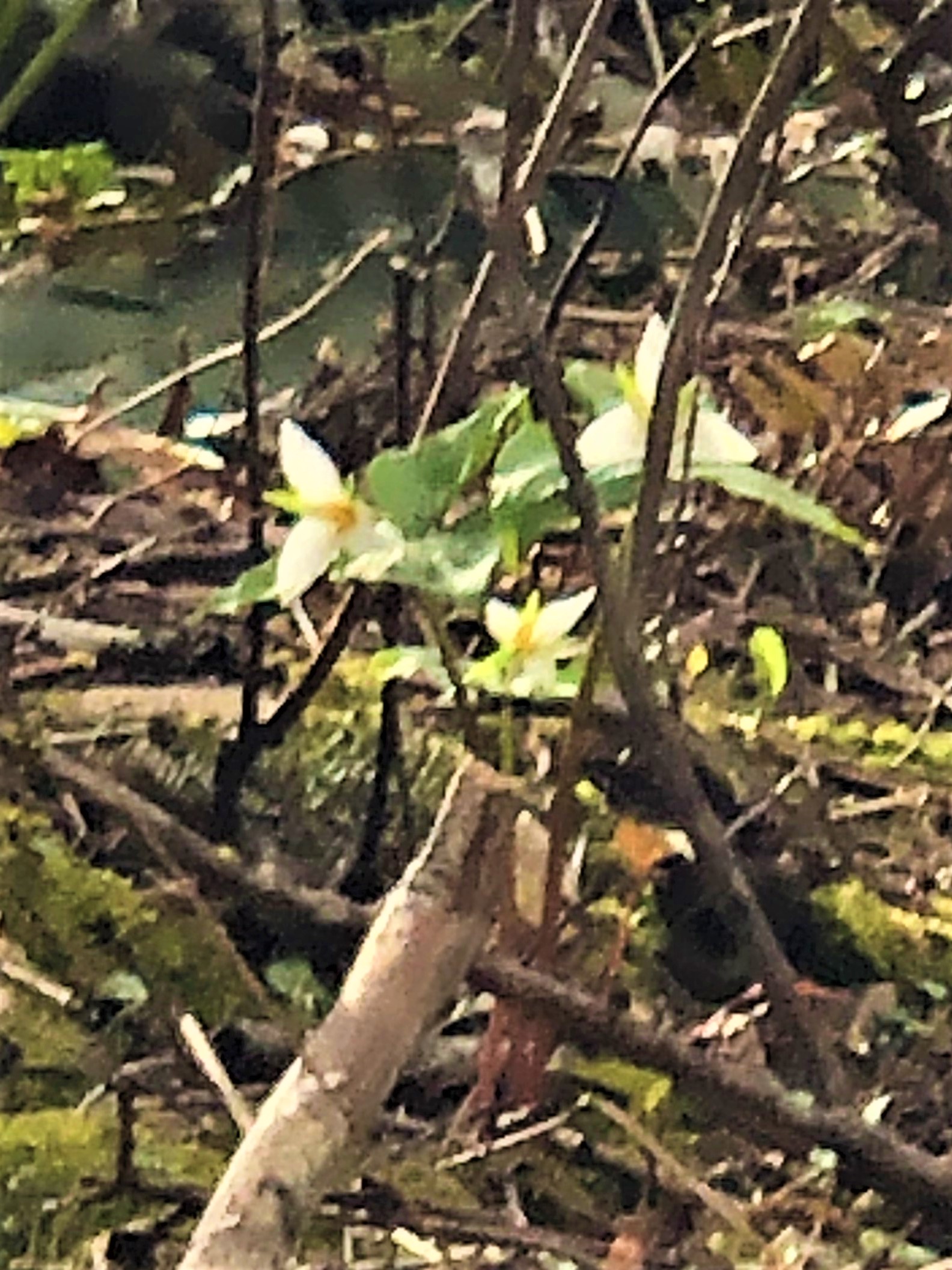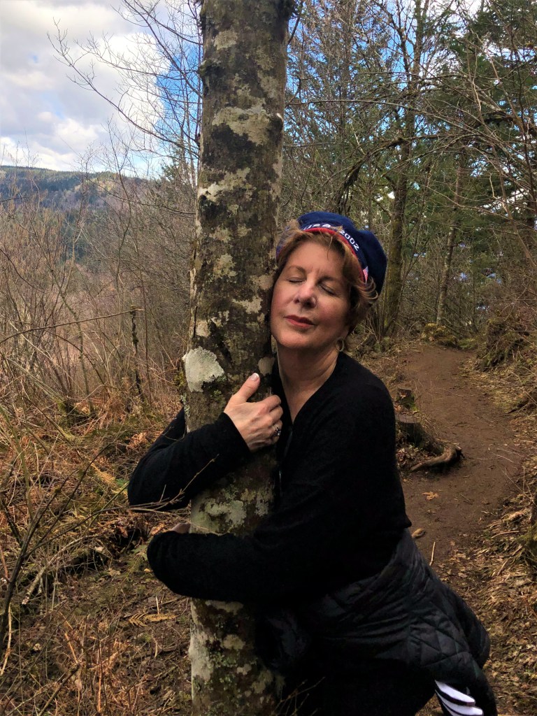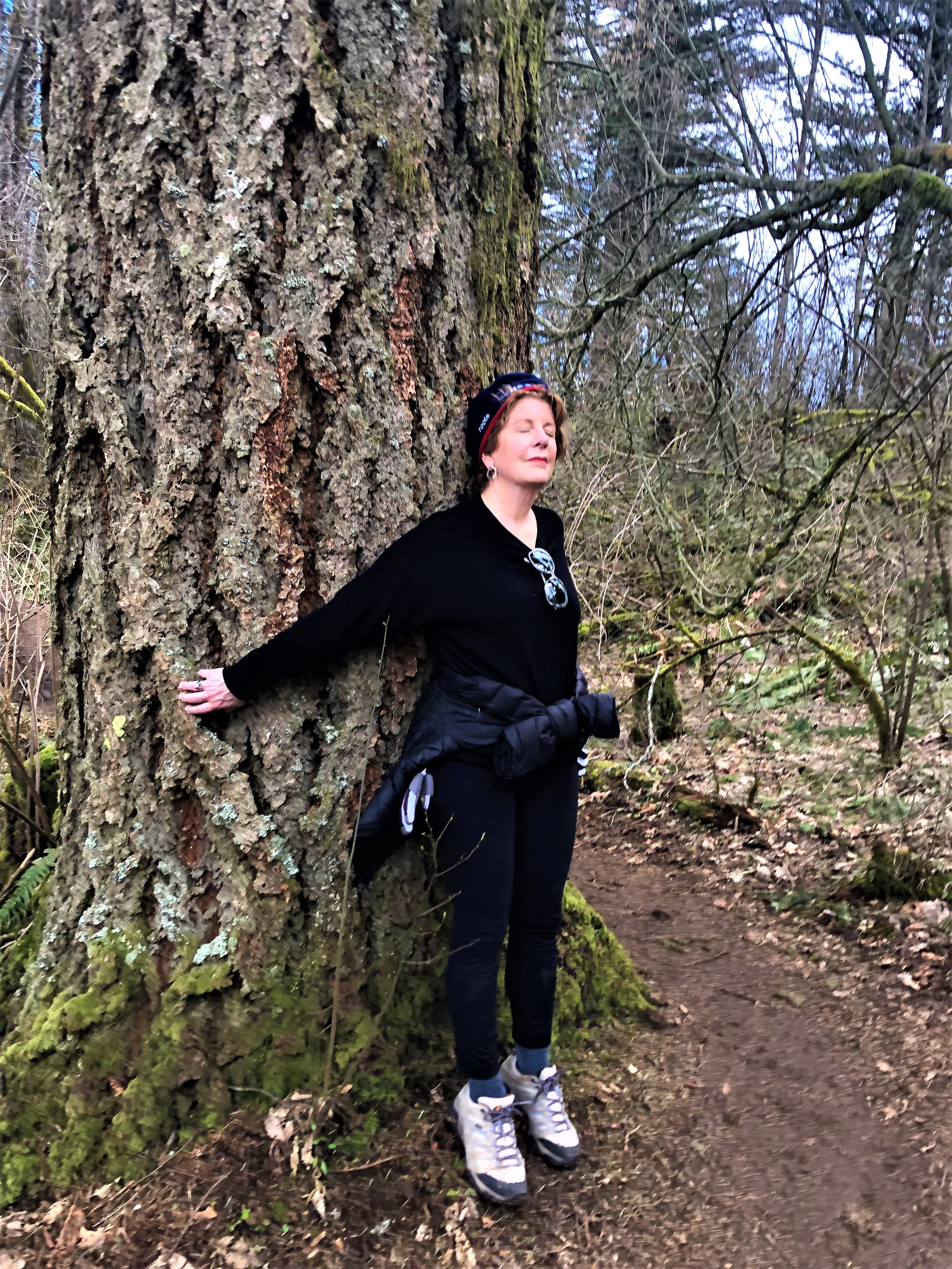 Tracy and I returned to the car from this viewpoint, which matched our time and limit for the day. We spotted trillium in bloom and the carefully lain stones of the trail builders, honoring Bigfoot for grins. Tracy always looks for trees that she can hug, saying they make her feel calmer around their steady trunks. This trip was no exception.