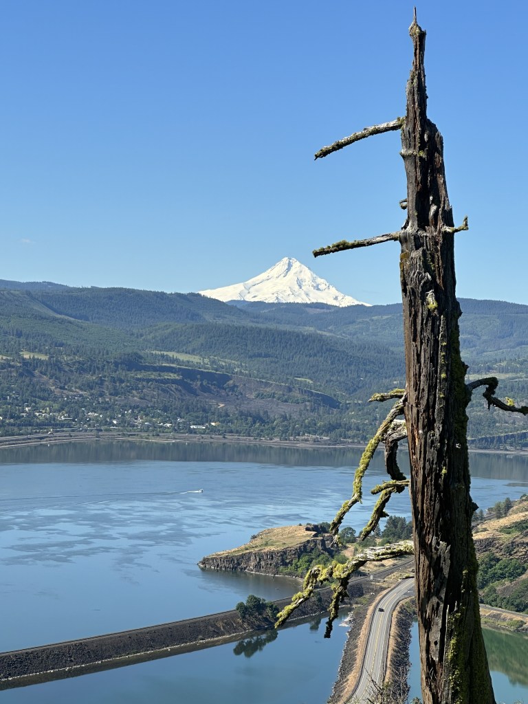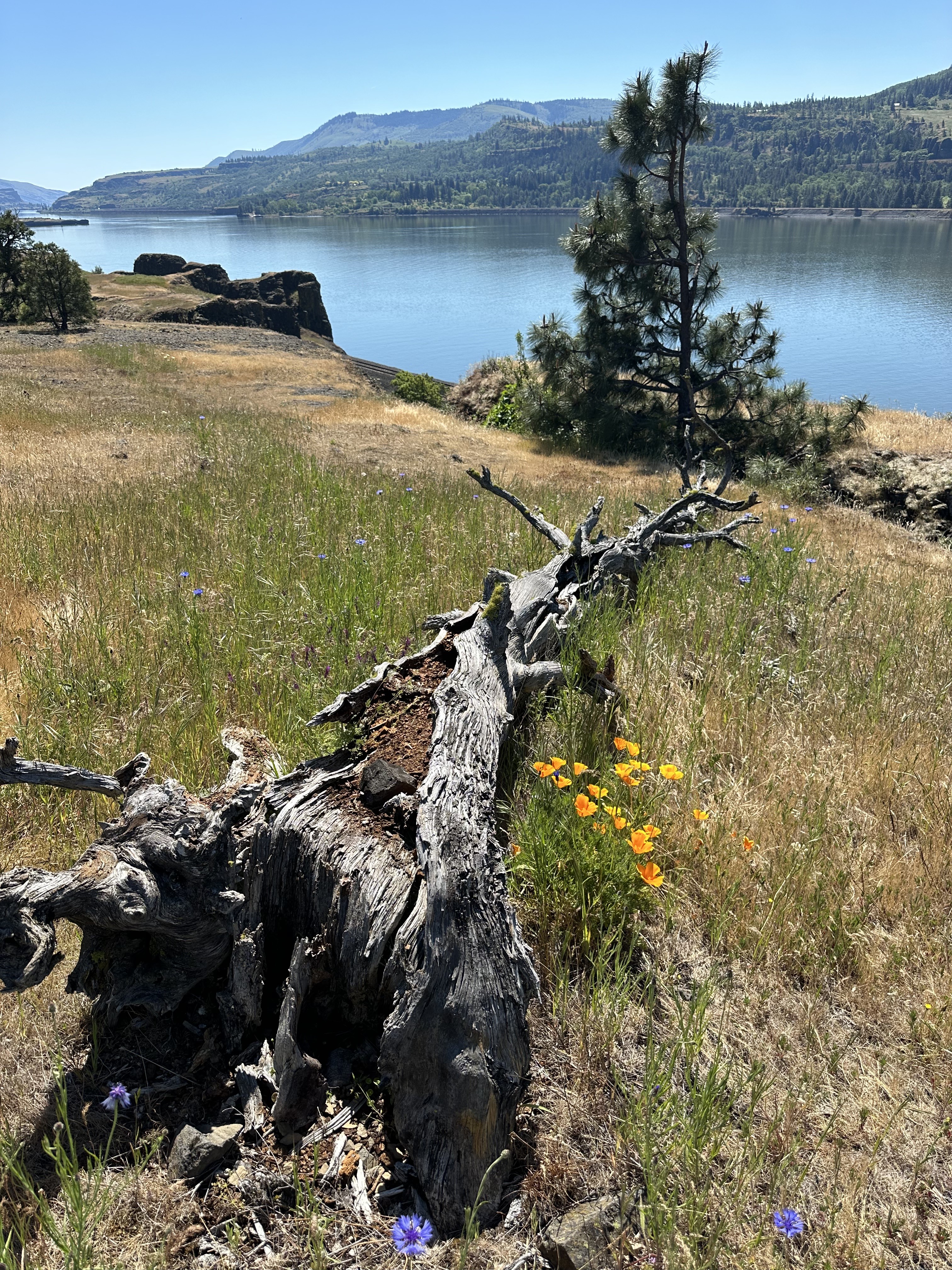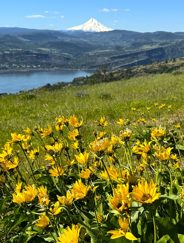 As you head up on the more open slope of Sunflower Hill (It gets this name from the brilliant display of balsamroot that travelers across the river used to remark upon; then the cattle were grazed here and now few balsamroot plants remain), you’ll get more expansive views to Mount Hood as well as the Rowena Gap, McCall Point, Sevenmile Hill, and the Columbia Hills to the east. Come to the powerline corridor at a pylon, and follow this up the open hillside, first getting views across the Rowland Basin to another beautiful hike known as the Labyrinth.