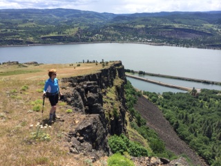 The black basalt is many, many layers of a cake, as we looked across the Gorge to the Oregon side. When we got to the cairn, we saw that those layers extended to our side of the River as well, forming a magnificent wall. The angle is apparently called a syncline, because of the way it folds with younger layers in the lower elevated sections as it tilts toward the River. At the edge of the Wall, the enormity of the basalt chunks that have fallen toward the River is as staggering as the drop-off. Not the spot for someone with acrophobia.