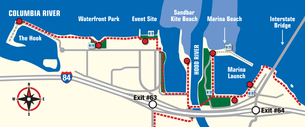 One of the surprising walks we found in Hood River is the Columbia River Waterfront Park walk, which extends from the Best Western on Marina Drive downriver, under the Interstate Bridge to White Salmon, Washington, past the beautiful beaches for Kite Boarders and Surfers, and around the Columbia River Hook, and back. The circuit is about 3.5 miles long (1.75 miles each way) and on a sunny day it is full of walkers and swimmers and bikers and fun.