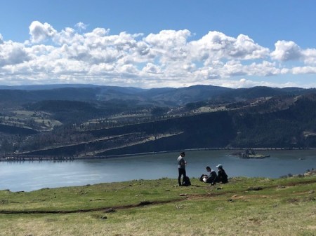 Up before dawn, we headed east along I-84 and earned magnificent views of the Columbia River that separates Oregon and Washington. We wanted to climb the mountains on the Washington side of the Columbia, east of Hood River. Our goal was to take advantage of Spring Break to get an early glimpse of the flowers in the Gorge. Touted as THE BEST springtime loop for hiking and flowers in the Gorge, we depended on the flower experts and the weather watchers to guide our choice. The Curious Gorge guidebook advised, “Expect wildflowers galore, unique terrain, waterfall-laden streamlets, mountain and river views — The total package!” And they were right.