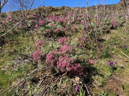 Along the way we heard the calls of flickers and meadowlarks in the brush and we spotted a vast array of purple wild flowers basking in the sunlight: mostly grass widows and gorge parsley.