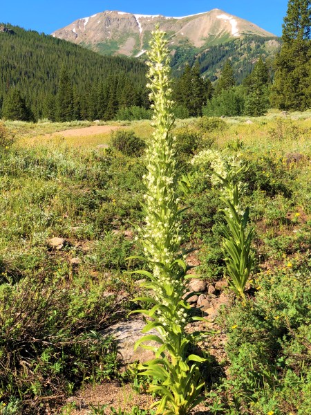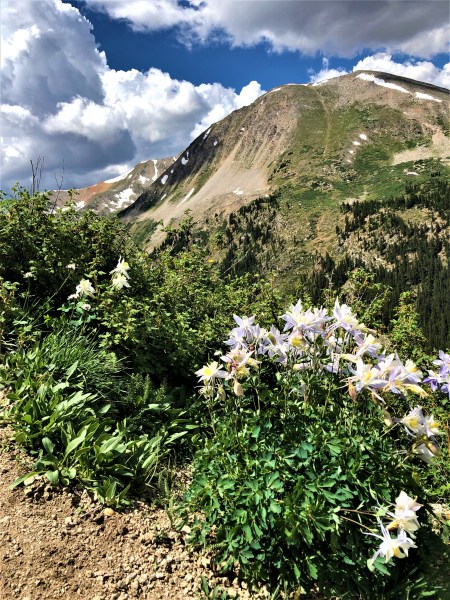 Two hours later than we wanted to be, we were finally back on the real trail and headed up the side canyon to La Plata. The copper colored water was cold and eerie, as if it were a mudslide or over-mined slurry run. We did not taste the water, fearing some contamination. The wild flowers were beautiful and in full flower, which was a visual treat for all of us. We passed through some valleys where trees had been mowed down like grass. After inspection it became clear that the ravine had been a winter avalanche area. Quite a devastating treefall, especially to the aspen in the valley.