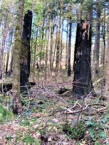 Hiking south from Cascade Locks, we travelled under US Route 84 to the Pacific Crest Trail trailhead and were immediately struck by the fire damage. All around us the base of all of the trees and the crowns of many of them were charred black from the forest fires that have ravaged the Gorge over the past few fire seasons. Seeing the trees up close was shocking, as although they were not smoking, the conflagration was devastating to the understory and the climax trees alike.
