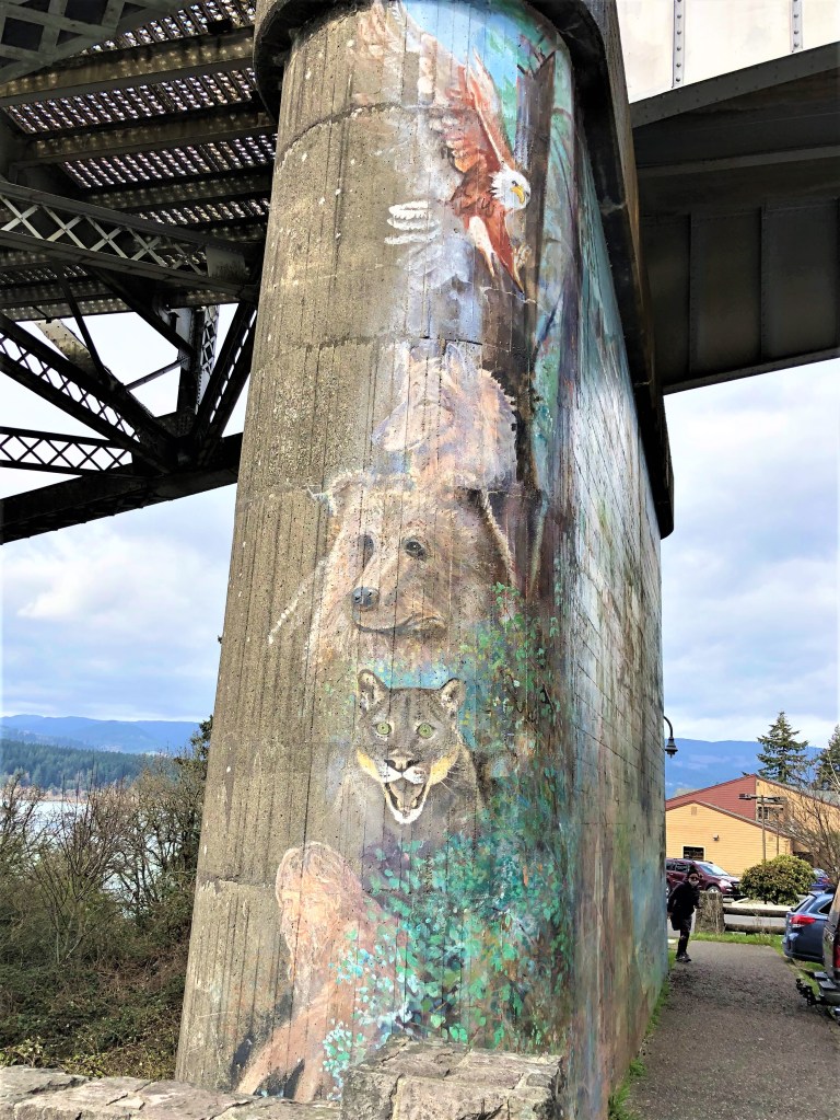 Pausing at the Bridge of the Gods, the murals on the cement base of the bridge (near visitors’ parking) were full of myth and legend. From Sasquatch to Lewis & Clark, and from Celilo Falls to the Gods at war [1], the painting was fun to explore. The challenge these days is to have public art that is not tagged by some idiot with a spray can of paint. These images seem to have missed the gang graffiti, probably because you have to be under the bridge to see it. The spot is not visible from Highway 84 or other frequently driven roads.