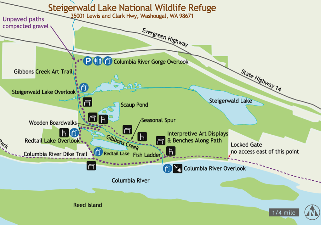 According to the kiosk at the beginning of the walk, the Refuge River Trail is “open to hikers, joggers, horseback riding, bicycles and dogs on leash”. This out-and-back trail follows the dike top along the Columbia River. The trail can be accessed from the western entrance of the Refuge near Index Street at the east end of William Clark Park or by the hiker only Mountain View Trail. There are a myriad of trails on the site, but we spent our time birdwatching on the Refuge River Trail and the Gibbon Creek Wildlife Art Trail. The trail surface of the trail is mostly compacted gravel except for .3 mile of soft sand between the Wildlife Art Trail connection points. We got a glimpse of Steigerwald Lake, Scaup Lake, Redtail Lake, and Reed Island on the Columbia River.