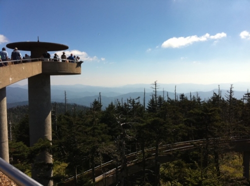Laurie and FB returned at noon and we departed for the AT trailhead at Newfound Gap toward Clingman’s Dome. It is a steep climb, though, and we were all winded when we got to the summit. The balsam fir and skunk cabbage offered an interesting contrast of smells to our sensitive olfactory organs. The hiking was great, up and until lunch. We passed a group of ecology students from UT (Tennessee) on their Saturday afternoon tour. They were not so thrilled with the prospects of the tour and the leader was managing things poorly. We climbed Indian Gap, Mount Collins, and Clingman’s Dome in not so quick succession. Easier said than done, as we jockeyed in and around complaining UT students. The final ascent to the dome was a 1,600 climb, which brought us to an altitude of 6,643, the highest point on the Appalachian Trail.