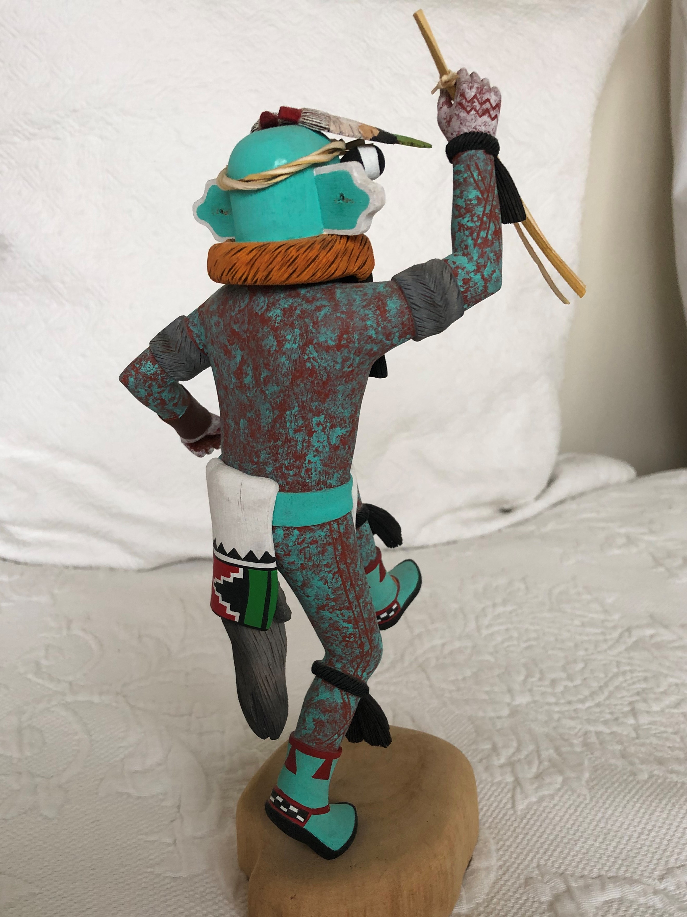 The Hu The Whipper Kachina is a favorite of the Hopi peoples as it is often painted is captured in beautiful detail. He purifies children, clowns, and Crow Mothers by whipping them with the yucca fronds that he carries in both hands. His fierce zigzag teeth represent a terrifying reminder of the persistent role of giants in the Hopi culture. He wears a neck ruff of fox and his head and body, typically painted black, is sometimes sponge painted in turquoise.