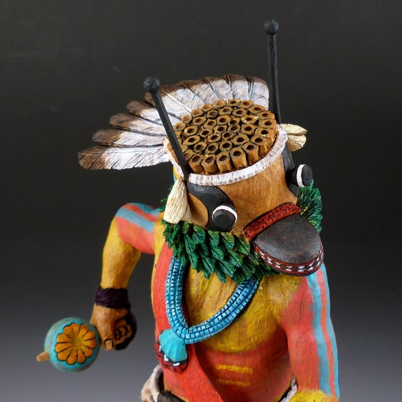 On the yellow mask of the Momo Kachina are black bands in a “U” shaped design over the cheeks and under the large pop-out eyes, which resemble the markings on a bumblebee. A shelf of feathers hang from the back of the mask and he has a snout with teeth. Horizontal green or blue stripes are painted on the back of the mask. The top of the mask is covered with cup-like cones representing wax honey cups. He has an antenna sticking up from each side of his head and many Momo Kachina have two corn husk cones hanging from the bases of each antenna. A fringe of fluff feathers surround the top of the mask. His ruff is either Douglas Fir or fox hide. His body is painted red or pink and yellow and he wears a turquoise necklace and a kato. His clothes are a kilt, sash, belt, breechcloth and fox hide. He has a hank of yarn around one wrist and one knee and a band of sleigh bells around the other. He wears ceremonial moccasins and carries a rattle and a small bow. During dances Momo carries the bow with an arrow in place, to be used like the sting of a bumblebee [3]