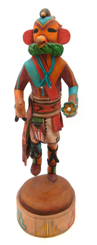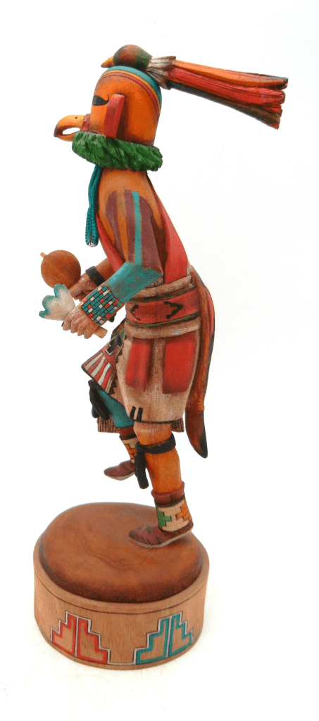 This particular doll, carved by Lauren Honyouti (Hopi) is bright and bold, and full of life. The Parrot Katsina (Koyona or Kyash) brings a vibrant presence to the Hopi ceremonial world. Associated with color, vitality, and the beauty of faraway lands, this Katsina reflects the influence of parrots whose feathers were once traded from Central and South American peoples into the American Southwest. Parrots are symbols of fertility, celebration, and cultural connection. The Hopi Parrot Katsina reminds us all that joy, color, and movement are not just art — they are sacred.