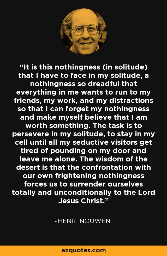 In the solitude we can slowly unmask the illusion of our possessiveness and discover in the center of our own self, that we are, not what we can conquer, but what is given to us. In solitude we can listen to the voice of him who spoke to us before we could speak a word, who healed us before we could make any gesture to help, who set us free long before we could free others, and who loved long before we could give love to anyone. It is in this solitude that we discover that being is more important than having and that I am worth more than the result of my efforts. In solitude I discovered that my life is not a possession to be defended, but a gift to be shared, and there I recognize that the healing words I speak are not just my own, but given to me, that the love I can express is part of the greater love and that the new life I bring forth is not a property to cling to but a gift to be received.
