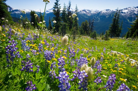 The Alpine (Arctic) Zone rises from Timberline to the top of the mountains. The climate is too severe for any trees to survive (hence the name timberline – no trees above that line). Soil forms slowly on rocky summits, but mosses, lichens, sages and grasses are at work breaking down the rocks to earth, patiently building humus. The plants that survive have all the sunlight to themselves, without trees to shade them. It is a land of tough, dwarf things: thistle, phlox, columbine and bear grass. Perennials, or low wooded mats with basal-like leaves and flowers only a few inches high, are the common pattern. The ever-present adverse conditions are low temperature, frequent precipitation and erratic, strong winds. They will blow your hat off.
