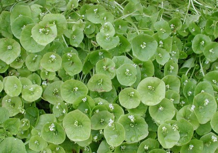 Often found at high and low altitudes, Miner’s Lettuce has two leaves that are fused together with the stem and white flowers in the center. They distinctly resemble a circle or heart shape with a deep, smooth green color and little flowers or bulbs in the center. The leaves are edible and taste great when you need some greens.
