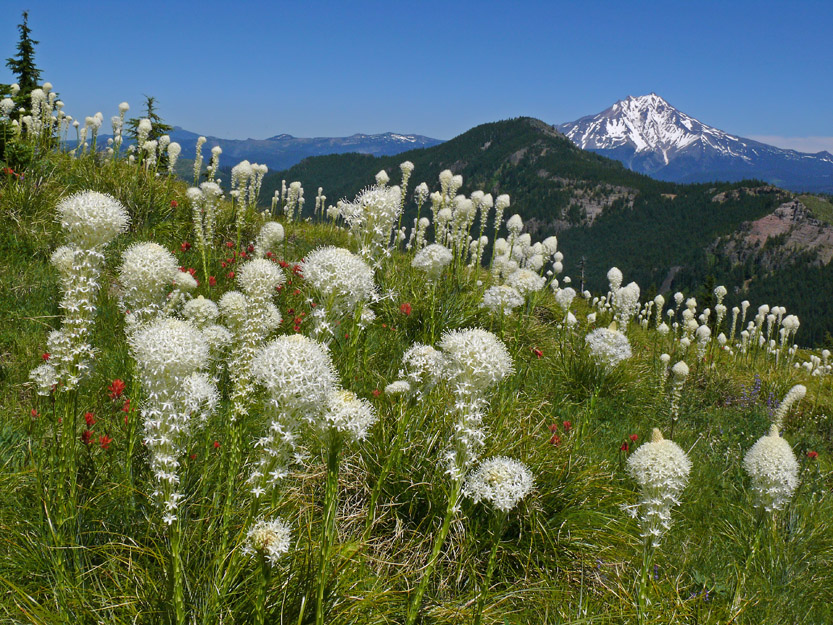 This showy plant from the Lily family is the official flower of Glacier National Park. The stems are quite sturdy and leafy and arise from a dense clump of basal leaves. The leaves have been used by some Native American tribes to weave their baskets. The magnificent head of white flowers has a rather unpleasant odor, which may be a means of attracting a pollinating agent like the fly.