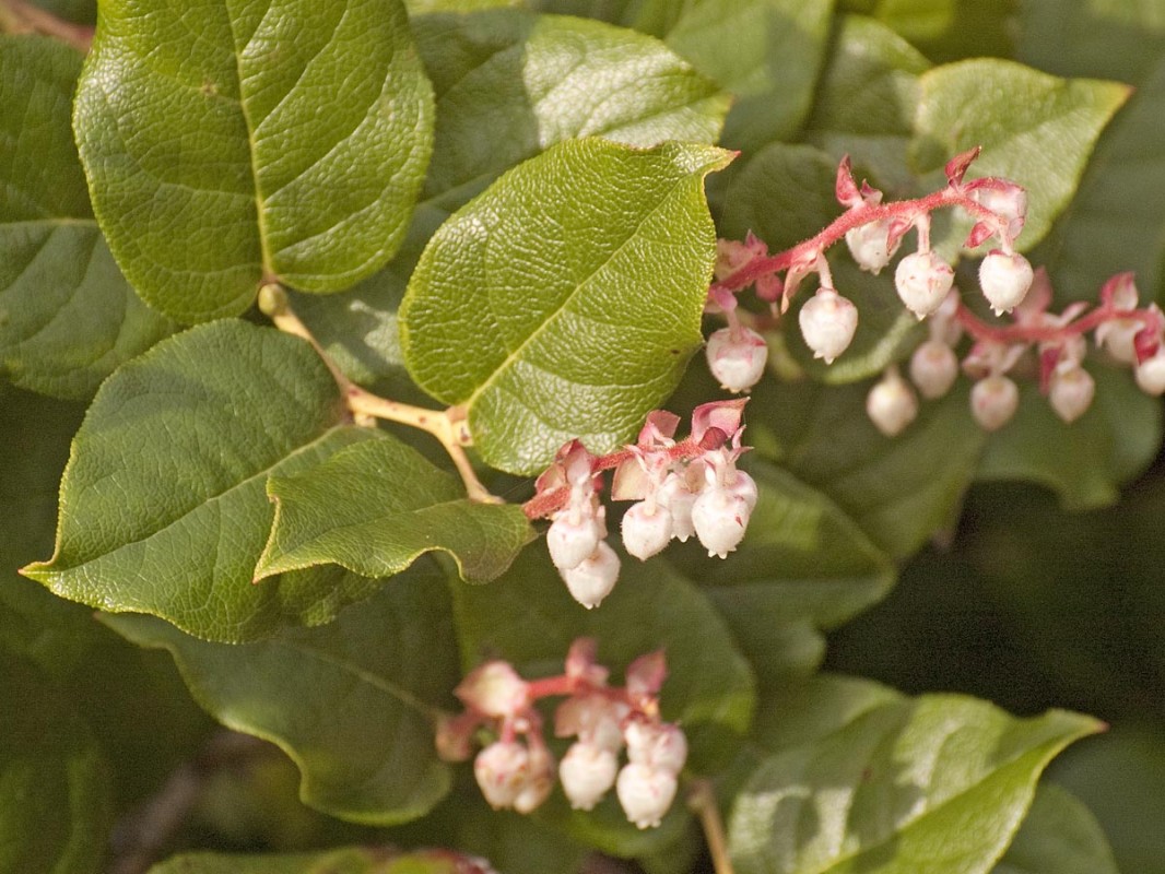A member of the Heath family, Salal has white flowers with a pinkish cast. They are urn shaped and hang like pendants in a row along a zig-zag stem. It has dark glossy green leaves and varies in height from several inches to several feet above the forest floor. In areas where it thrives, salal can make up a large part of the understory.