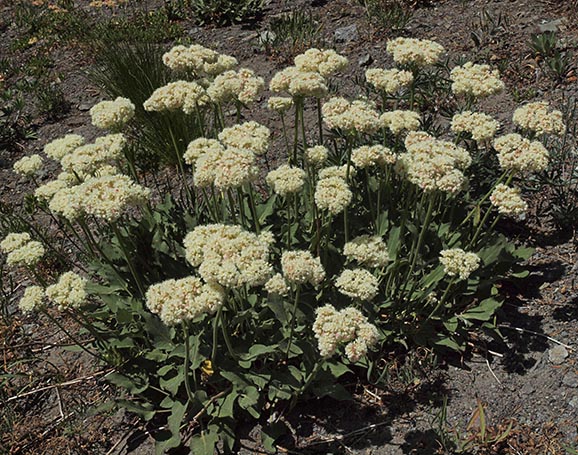 These little spreading outcroppings grow close to the ground and help reduce erosion. The yearly accumulation of leaves adds humus to the soil. The flower head is a dense cluster of white (or yellow). The flowers are important to the honey bee, and the ripened seeds are diligently horded by the chipmonks.