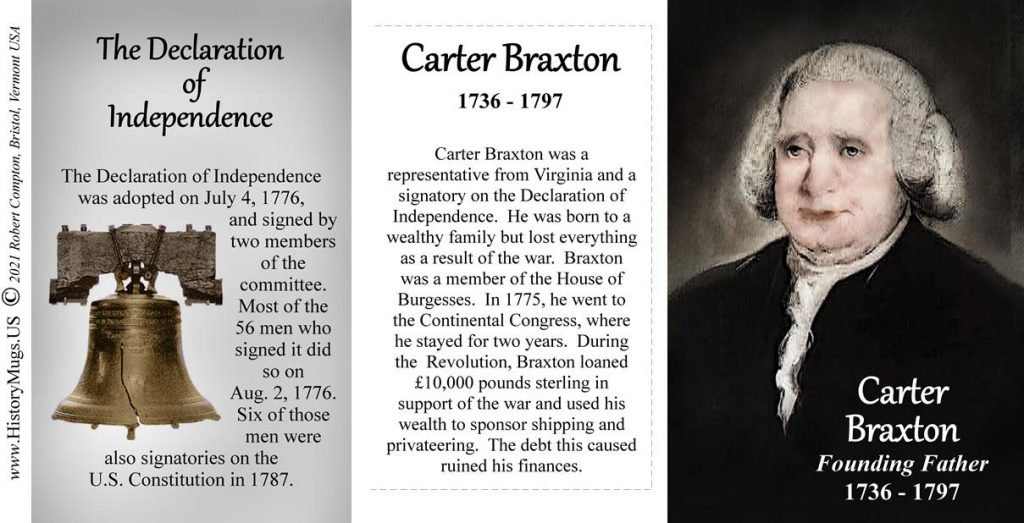 He was a descendant of Carter Braxton of Virginia, a merchant, planter and politician whose signature is the bottommost on the Declaration of Independence.