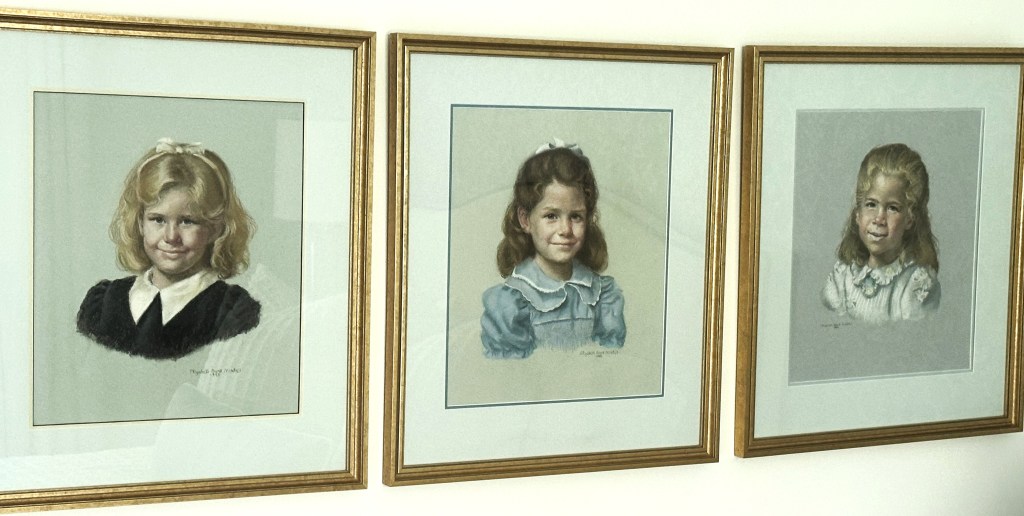 Mrs. Mitchell’s work is found in private, corporate and institutional collections throughout the country. She especially created three pastels of our daughters Kathleen, Eleanor & Margaret (at age 6) when we lived down the lane from Polly and Braxton in the late 1990s. They are Hooper treasures. As Tracy Hooper says, “If the house were on fire, I would drop everything and pick up those Polly Mitchell pastels.”