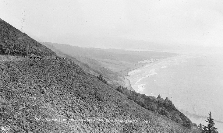 The panoramic view on the above is looking south along the Oregon coastline. The picture was photographed in 1915 from the steep slopes of Neah-kah-nie Mountain by Wesley Andrews, a producer of scenic view postcards. This is one of the treacherous trails that took travelers on foot over the mountain, connecting the beach trails from Arch Cape on the north with the beach visible in the distance. The trails had been in use for centuries by native Clatsop, Chinook, and Tillamook Indians and their neighbors.