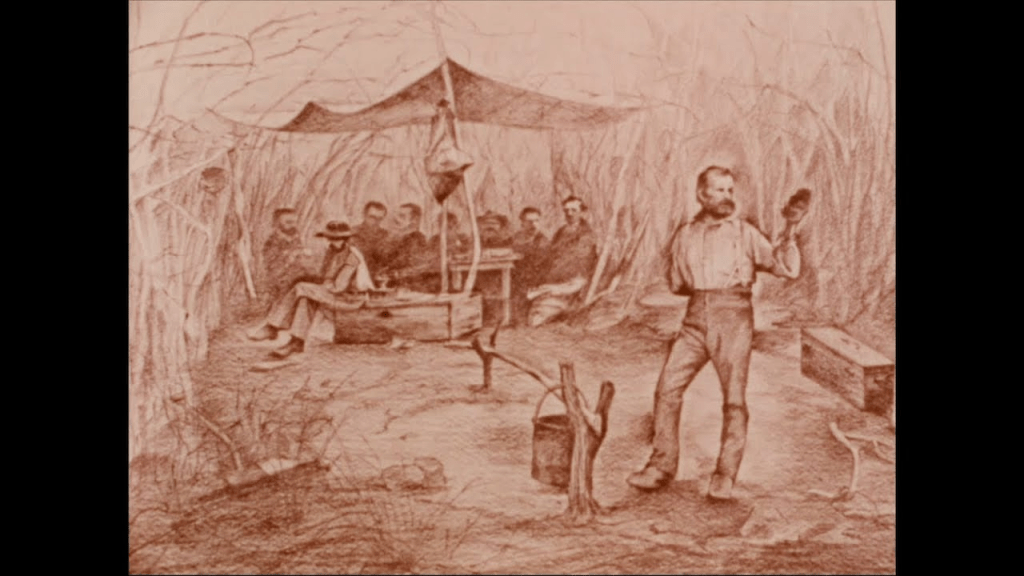 Image of one-armed John Wesley Powell, as his crew rested beneath a tarp