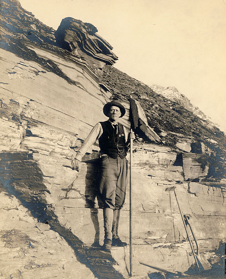 Although Walcott spent a considerable amount of time at the Burgess Shale quarry, he also traveled widely in other areas of the Canadian Rockies with his family. Some of his numerous scientific publications feature spectacular panoramic photographs of the mountains taken from high passes or high on mountain slopes with waterfalls in the background.
