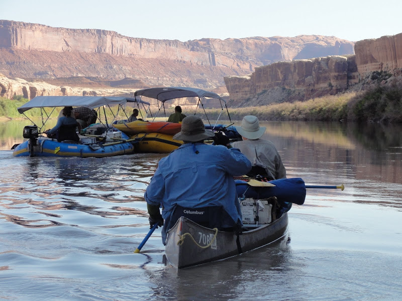 We got a good start the next morning and floated about a mile before we saw the other side of the lookout tower. The Green snaked its way 180 degrees and was carving out the sandstone as she went.Not long after making the bend, we saw a flotilla of rafts pass us the next day. They were under motor power moving speedily down the Green. From shouts back and forth we learned that they were in the middle of a 54 day float / rowing / motoring trip down the Colorado. They told us that they were ignoring any “no motor” rules because they were traveling so far. It was a long time to Lake Powell.