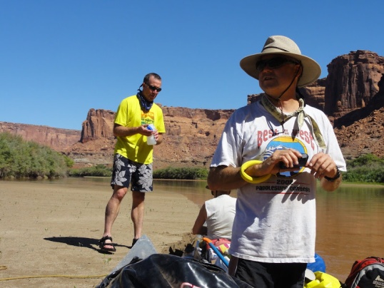 We had some calm water on the trip today and were able to enjoy the canyon as we progressed deeper and deeper into Canyonlands. We applied a fresh coating of sun screen, put our sunglasses on, secured our hats in place and prepared for the on-coming heat. The water temperature was probably in the 60’s but it still felt cold. The air temperature, conversely, shot up to the 80’s and the difference in the temperature when we were in the sun versus the shade was dramatic. It felt like a twenty degree differential. I could feel my lips getting drier and more chapped, so I kept some Bert’s Bees handy. That may have been a mistake, as later in the trip my lips blistered. I should have followed Gerry Hagquist’s example and put some zinc oxide on my lips instead. Live and learn.